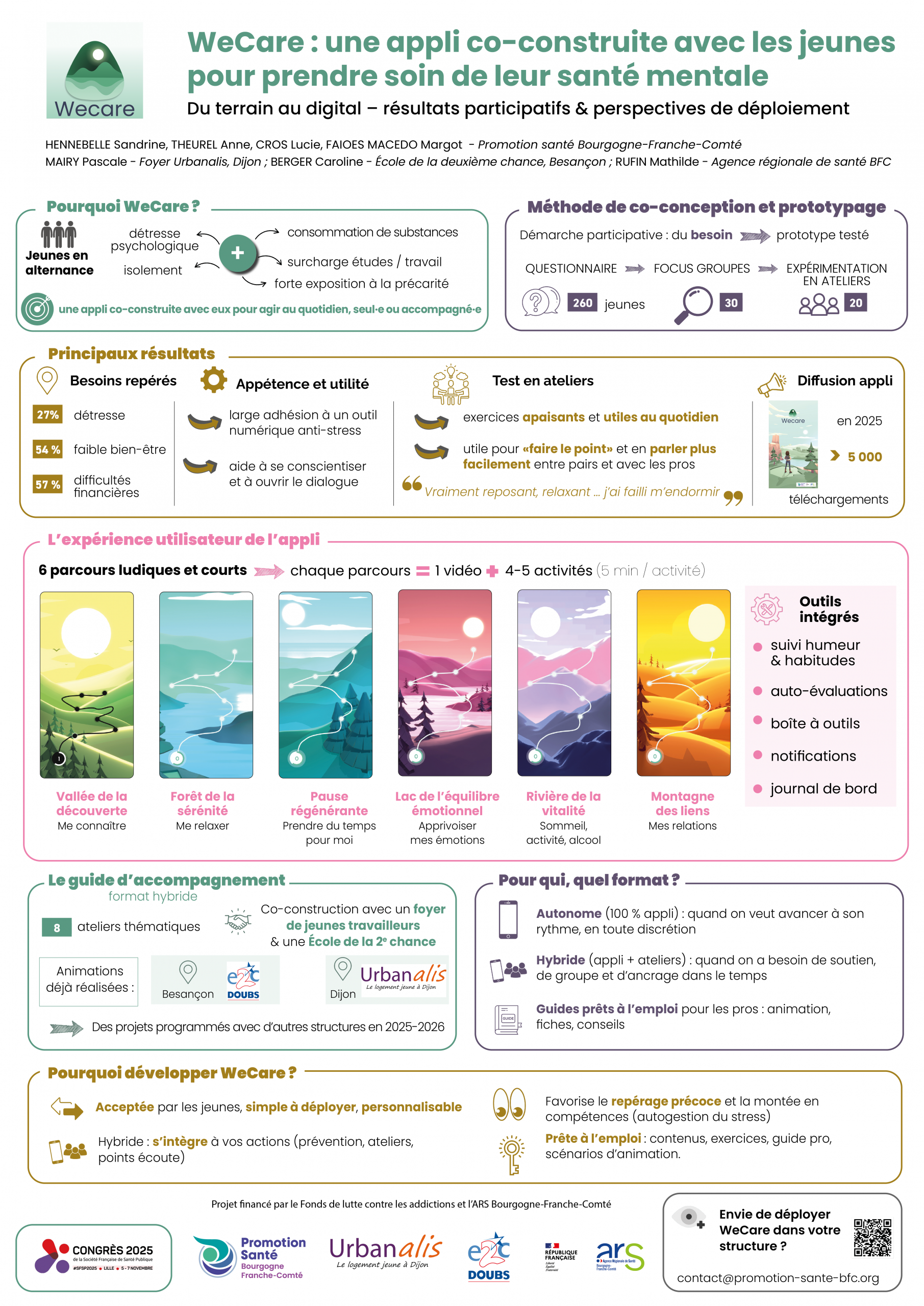 Hennebelle Sandrine, Theurel Anne, Cros Lucie, Faioes Macedo Margot, Mairy Pascale (et al.). WeCare : une appli co-construite avec les jeunes pour prendre soin de sa santé mentale. Du terrain au digital : résultats participatifs et perspectives de déploiement, Congrès de la Société Française de Santé Publique "Santé mentale publique", Lille. 5-7 novembre 2025